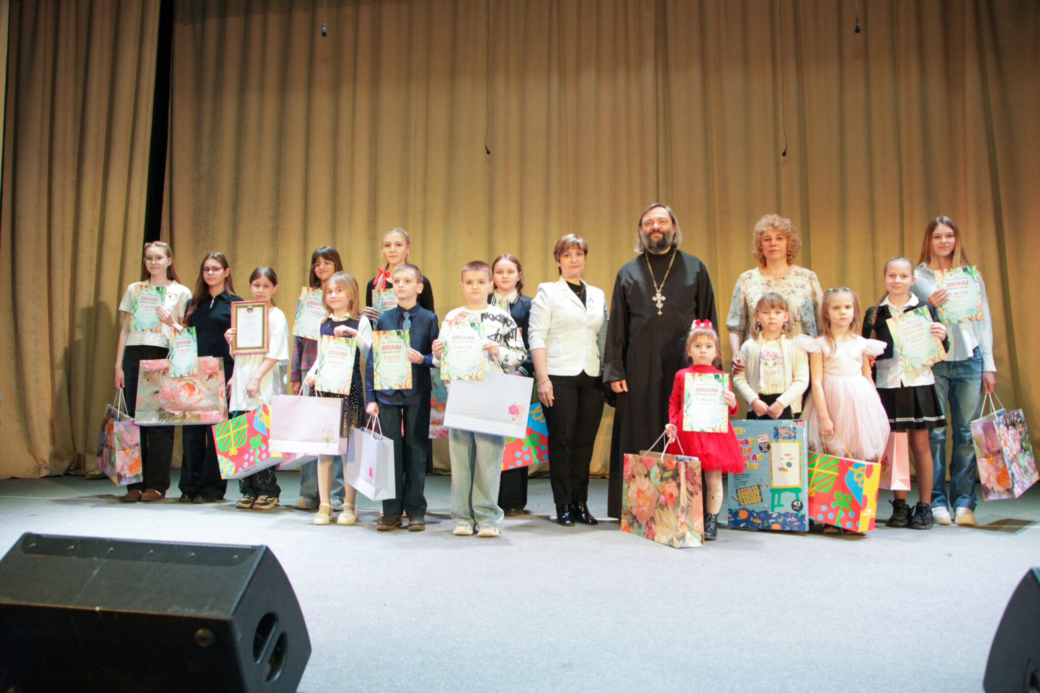 25 апреля в ДК «Родина» состоялось торжественное мероприятие награждение победителей конкурса «Светлое Христово Воскресение», которое прошло в два этапа. Сначала наградили детей дошкольного возраста, которым был показан детский Пасхальный спектакль, подготовленный учащимися Вознесенской воскресной школы, а затем состоялось мероприятие по награждению участников средней и старшей возрастной категории, которым был показан спектакль «Пасха красная», подготовленный театральной студией «Добрая воля» при Введенском храме. К собравшимся зрителем с пастырским словом обратился благочинный Каширского округа священник Валерий Сосковец